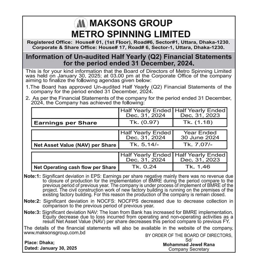 মেট্রো স্পিনিং লিমিটেডের দ্বিতীয় প্রান্তিকের আর্থিক প্রতিবেদনের মূল্যসংবেদনশী তথ্য