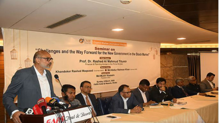 আজ রোববার রাজধানীর পল্টনের একটি হোটেলে আয়োজিত এক সেমিনারে প্রধান অতিথির বক্তব্যে এ কথাগুলো বলেন রাশেদ আল মাহমুদ তিতুমীর। ‘শেয়ারবাজারে নতুন সরকারের চ্যালেঞ্জ এবং করণীয়’ শীর্ষক এ সেমিনার আয়োজন করে পুঁজিবাজার-বিষয়ক সাংবাদিকদের সংগঠন ক্যাপিটাল মার্কেট জার্নালিস্টস ফোরাম (সিএমজেএফ)।