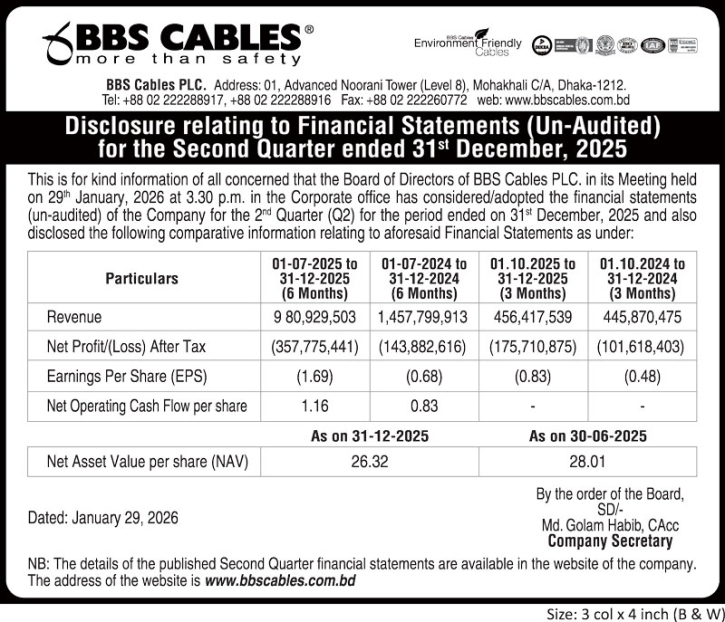 বিবিএস ক্যাবলসের দ্বিতীয় প্রান্তিকের আর্থিক বিবরণী প্রকাশ সংক্রান্ত মূল্যসংবেদনশীল তথ্য