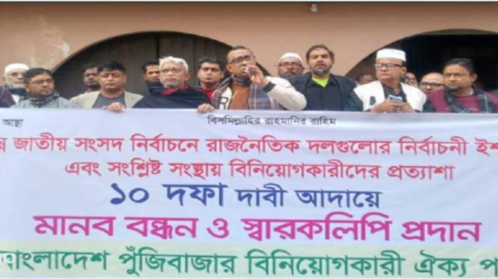 স্মারকলিপি প্রদানের আগে সকালে মতিঝিলে ঢাকা স্টক এক্সচেঞ্জের (ডিএসই) পুরোনো ভবনের সামনে এক বিশাল মানববন্ধন কর্মসূচি পালন করেন সাধারণ বিনিয়োগকারীরা। মানববন্ধনে বক্তারা অভিযোগ করেন, আর্থিক প্রতিষ্ঠানগুলো অবসায়ন করা হলে সাধারণ বিনিয়োগকারীরা তাদের কষ্টার্জিত পুঁজি হারাবেন। নিয়ন্ত্রক সংস্থাগুলোর ভুল নীতি বা অব্যবস্থাপনার দায় সাধারণ বিনিয়োগকারীরা কেন নেবে—এমন প্রশ্ন তুলে তারা এই আত্মঘাতী সিদ্ধান্ত থেকে সরে আসার আহ্বান জানান।